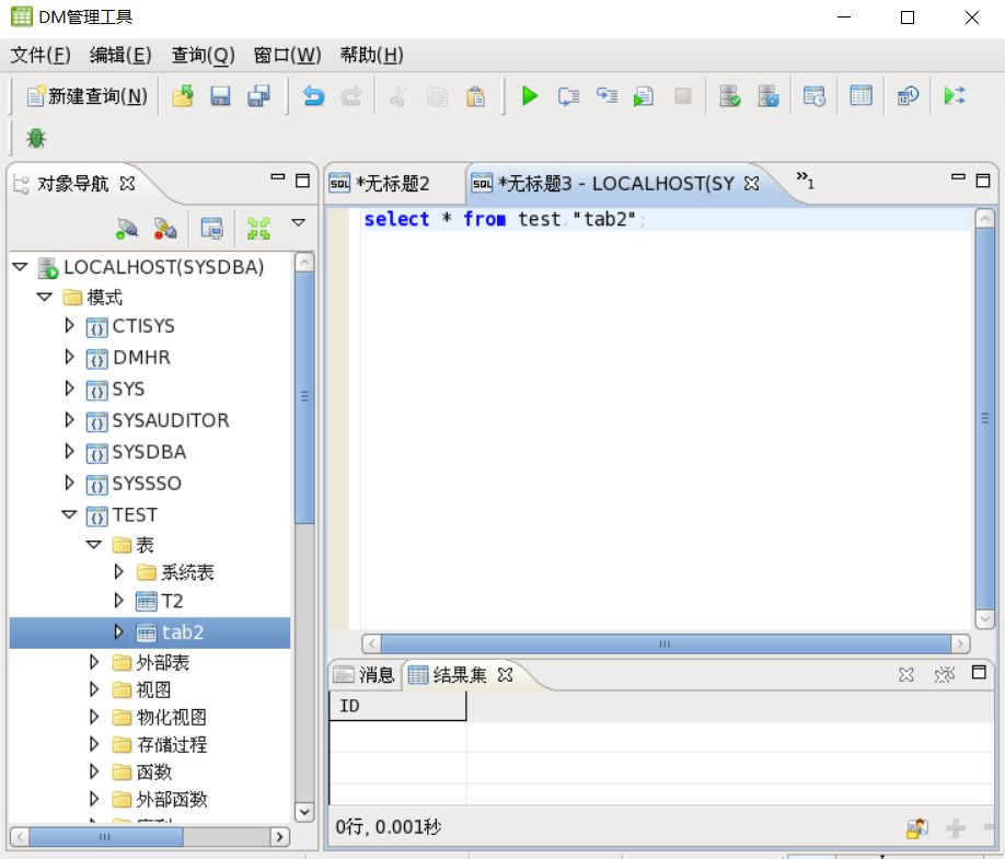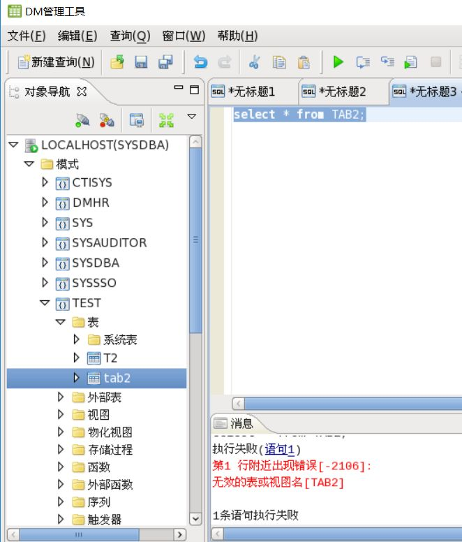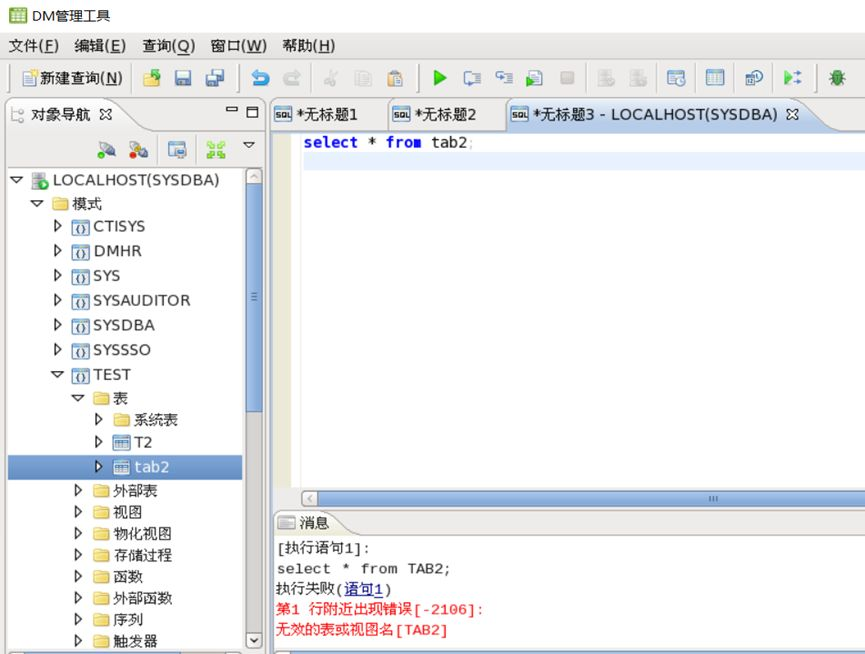 在操作DM时遇到报错,错误信息提示为“无效的表或视图名”。无论是查询tab2还是TAB2都是报错。