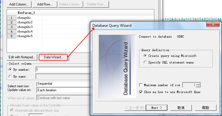 | 唯一(Unique) | 每次出现(Each occurrence) 步长为1 | 结果:分别将15条数据写入数据表中 功能说明:第一次迭代取参数化文件中的第一条数据,第二次迭代取第二条数据,以此类推。 注:如果设置迭代次数为16次,而参数化文件中只有15条数据,明显数据不够。此时可以设置“when out of values”属性来判断当数据不够时的处理方式 Abort Vuser:中断虚拟用户 Countinue in a cylic manage:循环取参数化文件中的值,即:当参数化文件中的值取完后又从参数化文件的第一行开始取值。 Countinue with last value:继续用最后一条数据 |