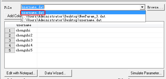 点击“Properites…”会打开编辑用户名参数化窗口。File列表框中,刚才保存用户名信息的文件"username.dat"。