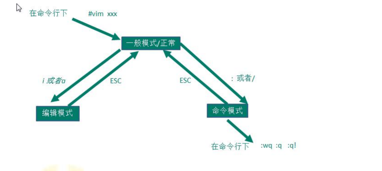总结:进入vim为普通模式,在普通模式下输入i进入编辑,在编辑模式下按下Esc退回普通模式,在普通模式下输入:或者/ 进入命令行模式。命令行下输入wq保存退出,输入q!不保存退出。按下Esc退回普通模式。