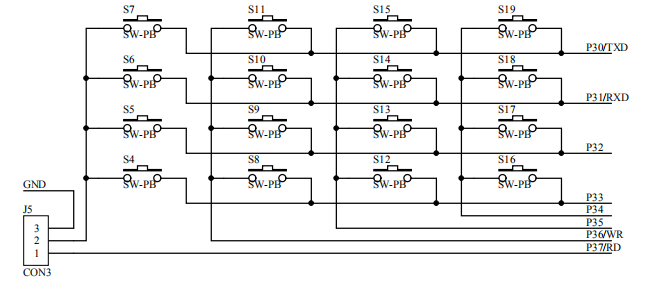 如果要用按键P30—P36时,J5要接2和3,要用P37时,J5要接1和2;对于P30对应于S7,当S7按下去时,P30=0;