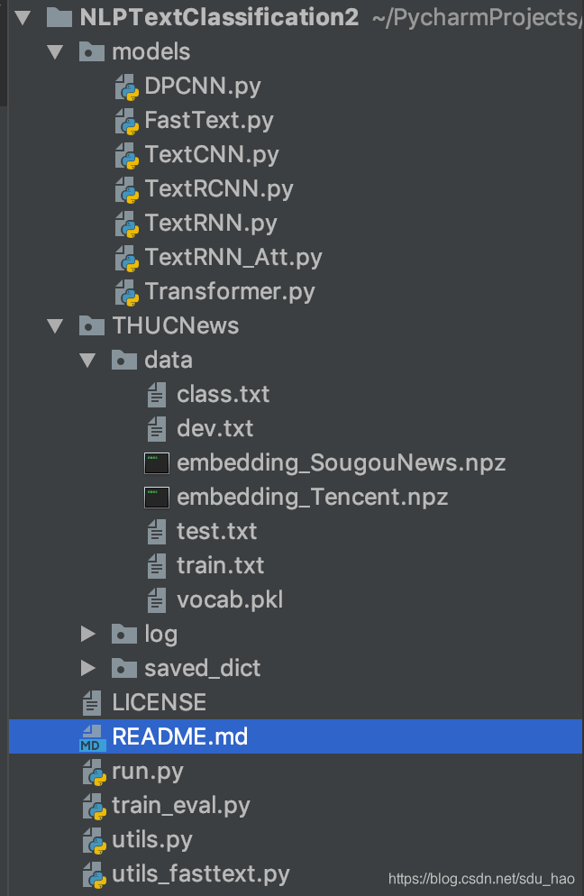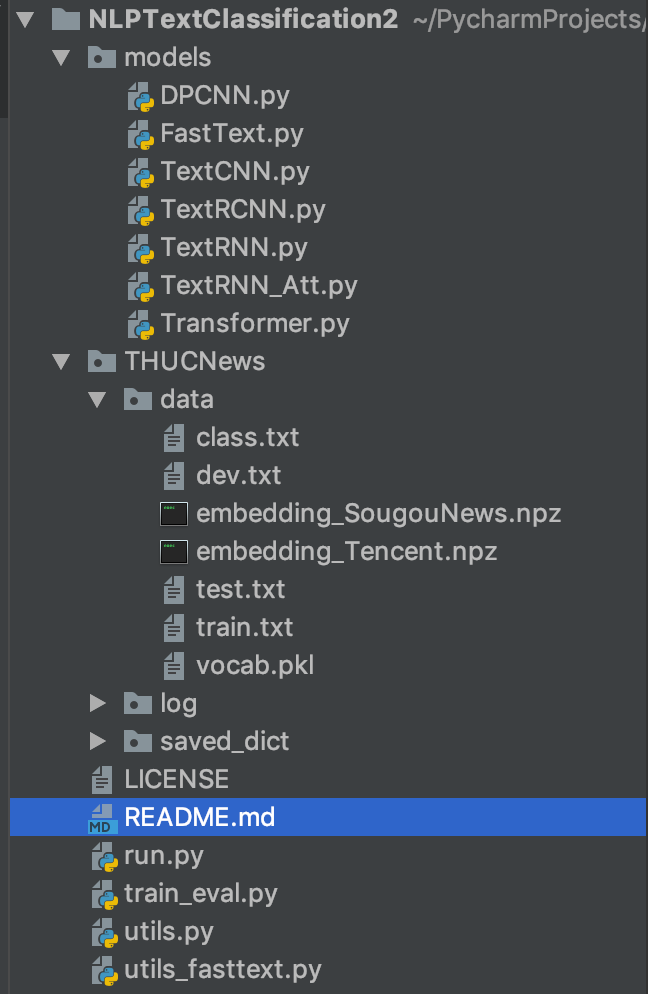 2)THUCnews/data:存储训练集、验证集、测试集(处理成txt格式,每条数据一行,格式:文本<tab>标签);构建好的字典/词典;预训练词向量/字向量(可以使用开源的词向量/字向量(推荐),也可以自己基于数据集训练(word2vec,glove,fasttext)).