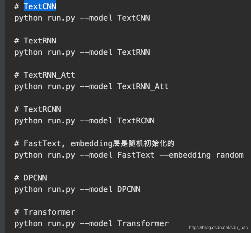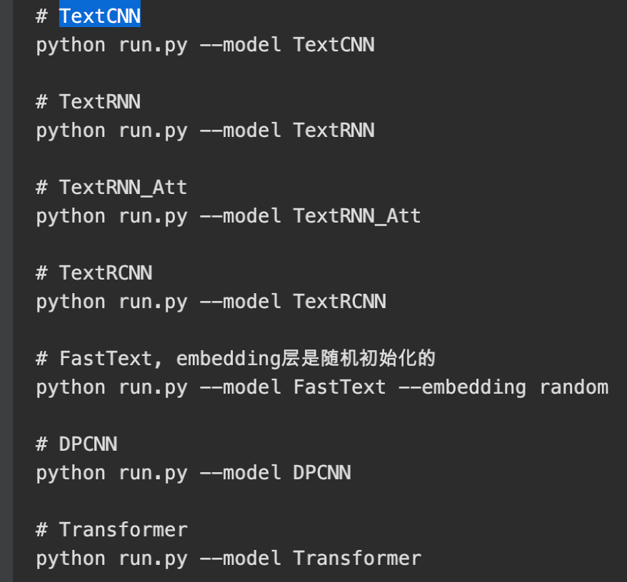 python --model ModelName(必填,如TextCNN、DPCNN等) --embedding pre_trained(默认)/random --word False(默认 character-level)/True