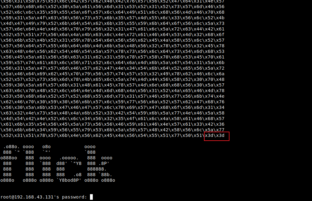 22端口,先试着连接ssh,发现如下不明字符串。末尾为\x3d,推测为base64编码。 -