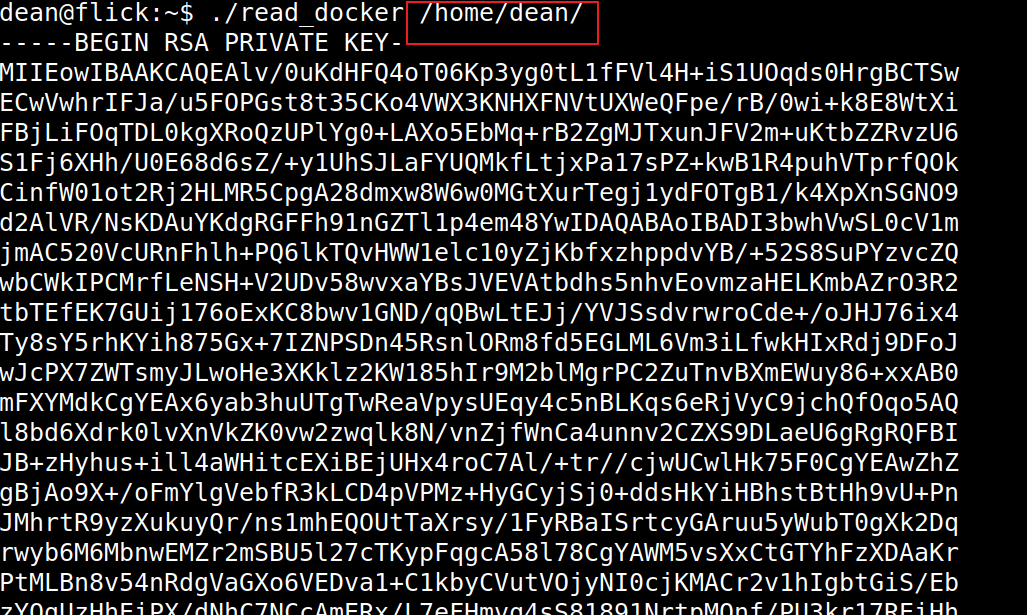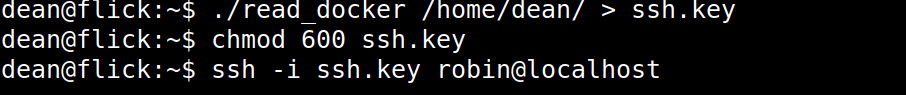 /Dockerfile.所以我们通过软连接方式将robin家目录下.ssh/id_rsa文件连接到我们(dean)目录下Dockerfile,是否可以读取他的ssh密匙呢?读取成功。