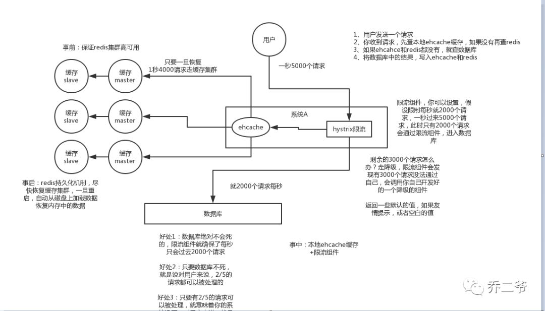 这种方案就是在发生雪崩前对缓存集群实现高可用,如果是使用 Redis,可以使用 主从+哨兵 ,Redis Cluster 来避免 Redis 全盘崩溃的情况。