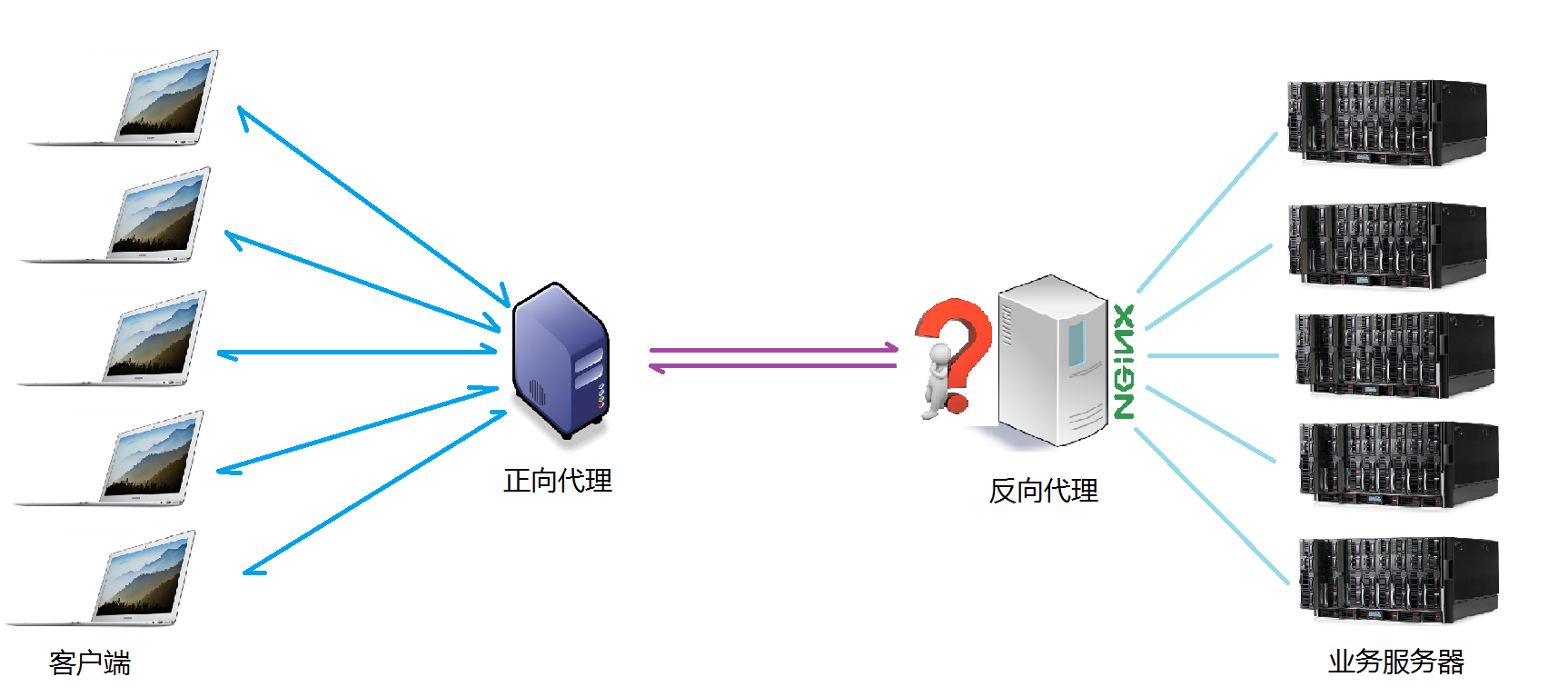 通过上述的图解大家就可以看清楚了,多个客户端给服务器发送的请求,nginx服务器接收到之后,按照一定的规则分发给了后端的业务处理服务器进行处理了。此时~请求的来源也就是客户端是明确的,但是请求具体由哪台服务器处理的并不明确了,nginx扮演的就是一个反向代理角色