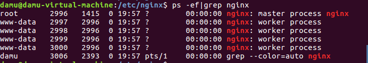 备注:这里启动的服务进程其实是4个进程,因为nginx进程在启动的时候,会附带一个守护进程,用于保护正式进程不被异常终止;如果守护进程一旦返现nginx继承被终止了,会自动重启该进程。