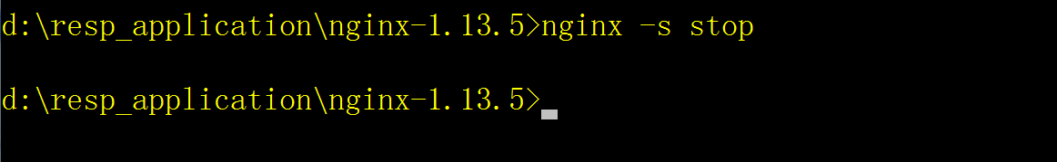 # 强制停止nginx服务器,如果有未处理的数据,丢弃 D:/resp_application/nginx-1.13.5> nginx -s stop # 优雅的停止nginx服务器,如果有未处理的数据,等待处理完成之后停止 D:/resp_application/nginx-1.13.5> nginx -s quit