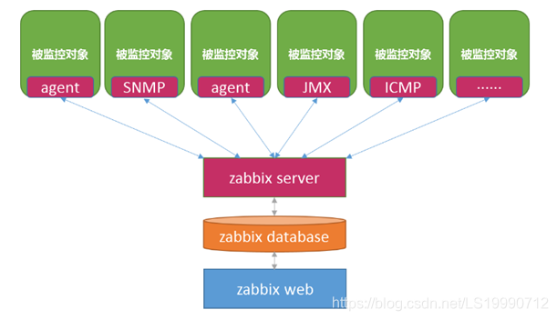 (1)由server和agent程序协同工作,如果是分布式监控还需要proxy程序。