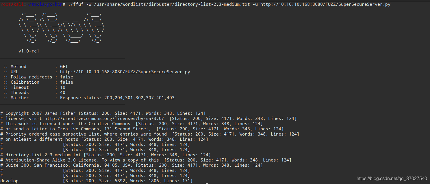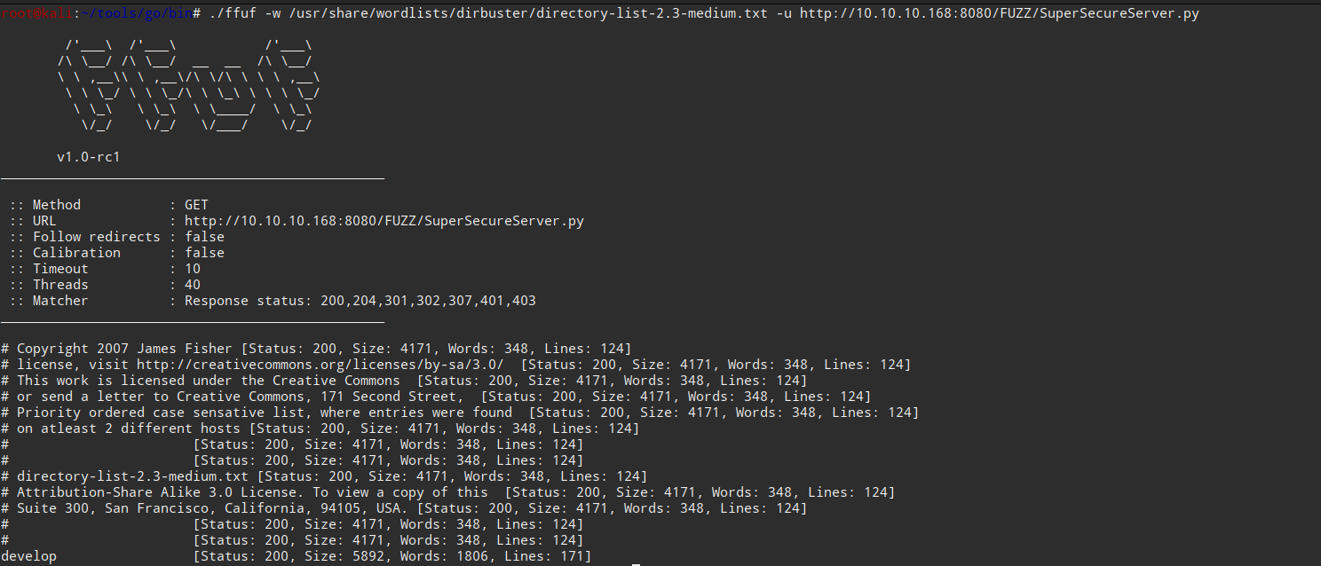 Message to server devs: the current source code for the web server is in 'SuperSecureServer.py' in the secret development directory的提示,这里就需要使用工具对网站进行fuzz测试,这里可以使用burp的intruder,推荐一个软件ffuf,安装之后对SuperSecureServer.py文件所在的目录进行爆破探测,很快就能发现这个秘密的目录了。