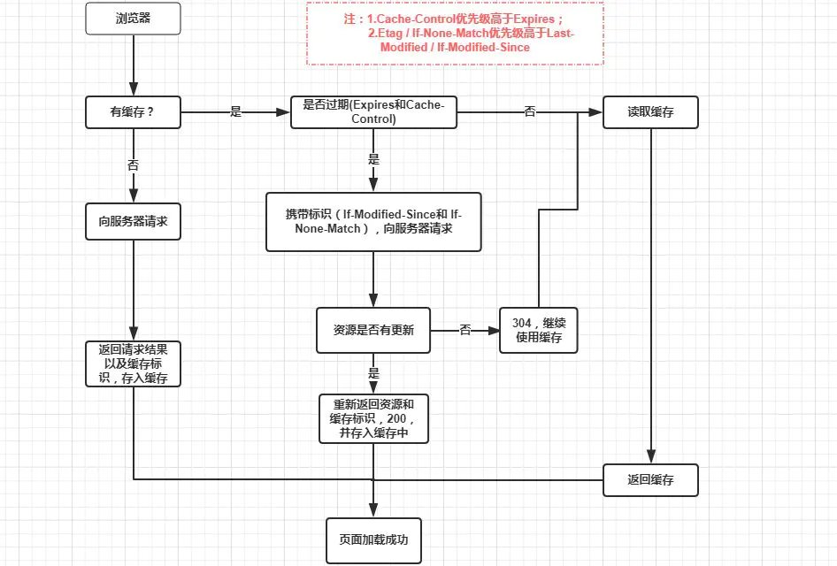 强制缓存优先于协商缓存进行,若强制缓存(Expires和Cache-Control)生效则直接使用缓存,若不生效则进行协商缓存(Last-Modified / If-Modified-Since和Etag / If-None-Match),协商缓存由服务器决定是否使用缓存,若协商缓存失效,那么代表该请求的缓存失效,重新获取请求结果,再存入浏览器缓存中;生效则返回304,继续使用缓存,主要过程如下: