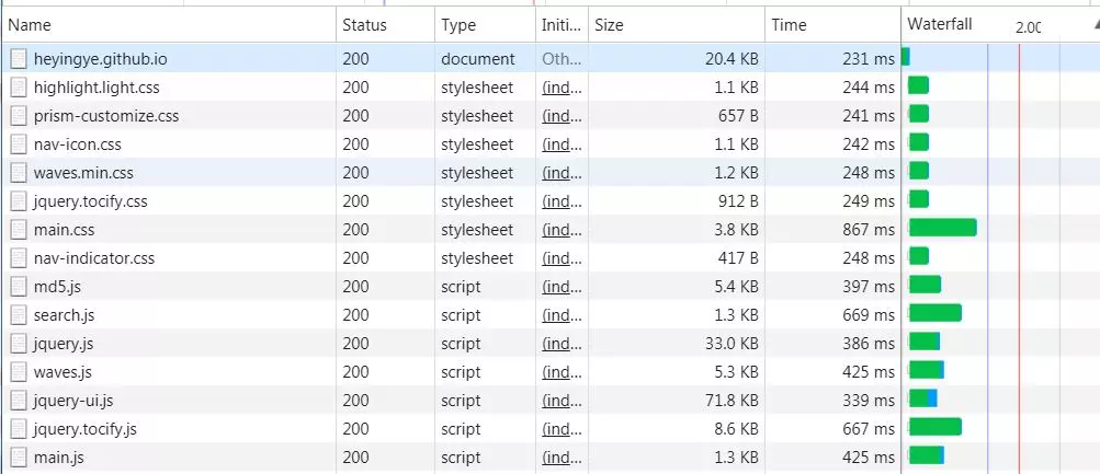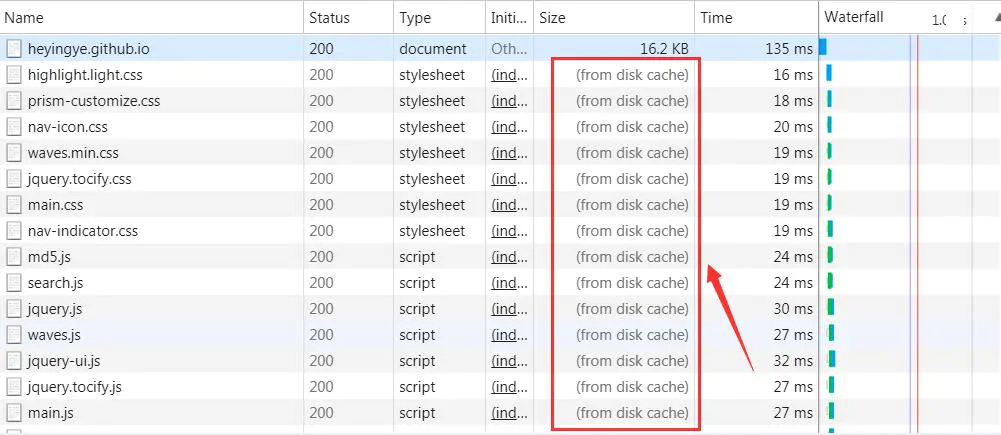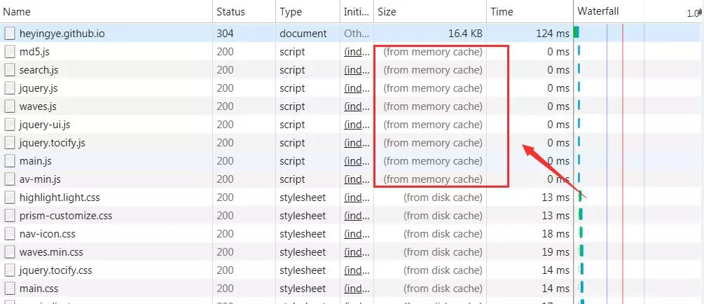 这里我们以博客的请求为例,状态码为灰色的请求则代表使用了强制缓存,请求对应的Size值则代表该缓存存放的位置,分别为from memory cache 和 from disk cache。那么from memory cache 和 from disk cache又分别代表的是什么呢?什么时候会使用from disk cache,什么时候会使用from memory cache呢?