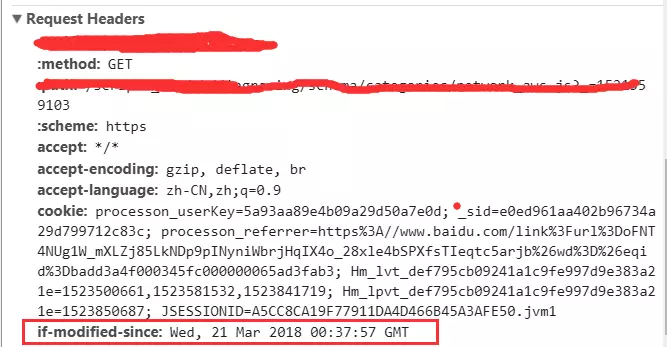 If-Modified-Since则是客户端再次发起该请求时,携带上次请求返回的Last-Modified值,通过此字段值告诉服务器该资源上次请求返回的最后被修改时间。服务器收到该请求,发现请求头含有If-Modified-Since字段,则会根据If-Modified-Since的字段值与该资源在服务器的最后被修改时间做对比,若服务器的资源最后被修改时间大于If-Modified-Since的字段值,则重新返回资源,状态码为200;否则则返回304,代表资源无更新,可继续使用缓存文件,如下。