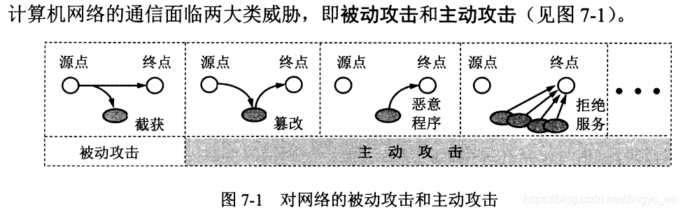 拒绝服务 DoS :攻击者向互联网上的某个服务器不断发送大量分组,使该服务器无法提供正常服务,甚至完全瘫痪。