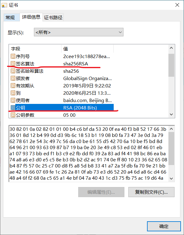 在详细信息中能看到 公钥 + 签名算法: