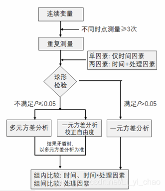 各时点指标变量满足球形假设(Sphericity 假设),通常用Mauchly方法检验是否满足球形假设,若检验结果P>0.05,认为满足;若P<0.05,则不满足。当资料满足球形假设时,可直接进行一元方差分析;不满足时,应以多元方差分析结果为准。