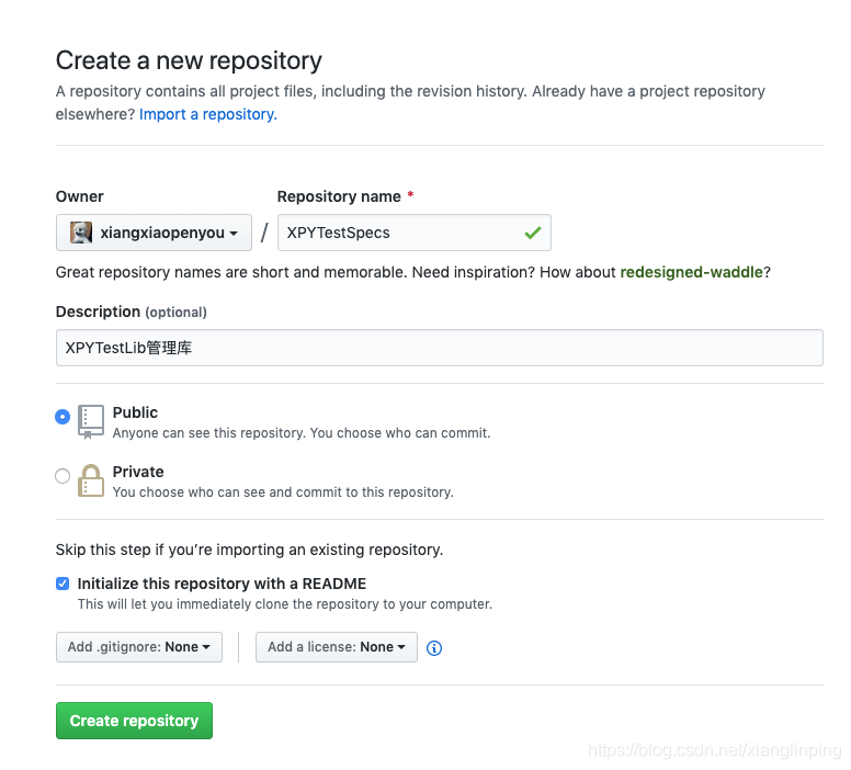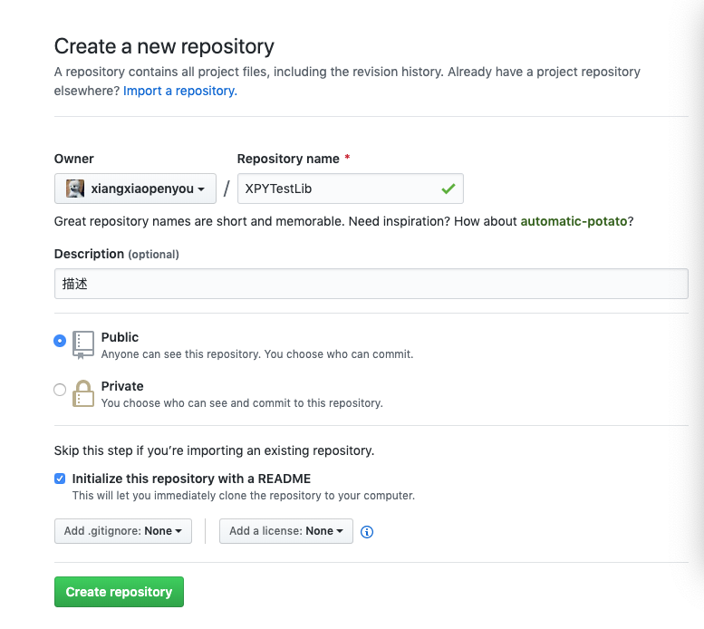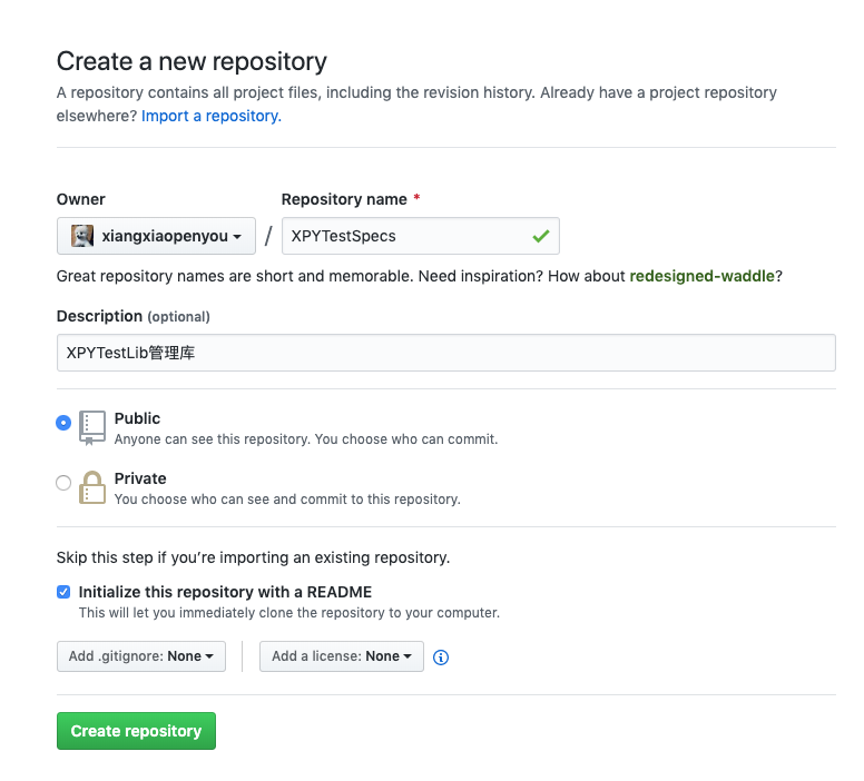这里使用github创建XPYTestLib项目,Private需要收费,暂时使用Public。.gitignore和license文件可以不选,因为后面创建本地库的时候会自动创建