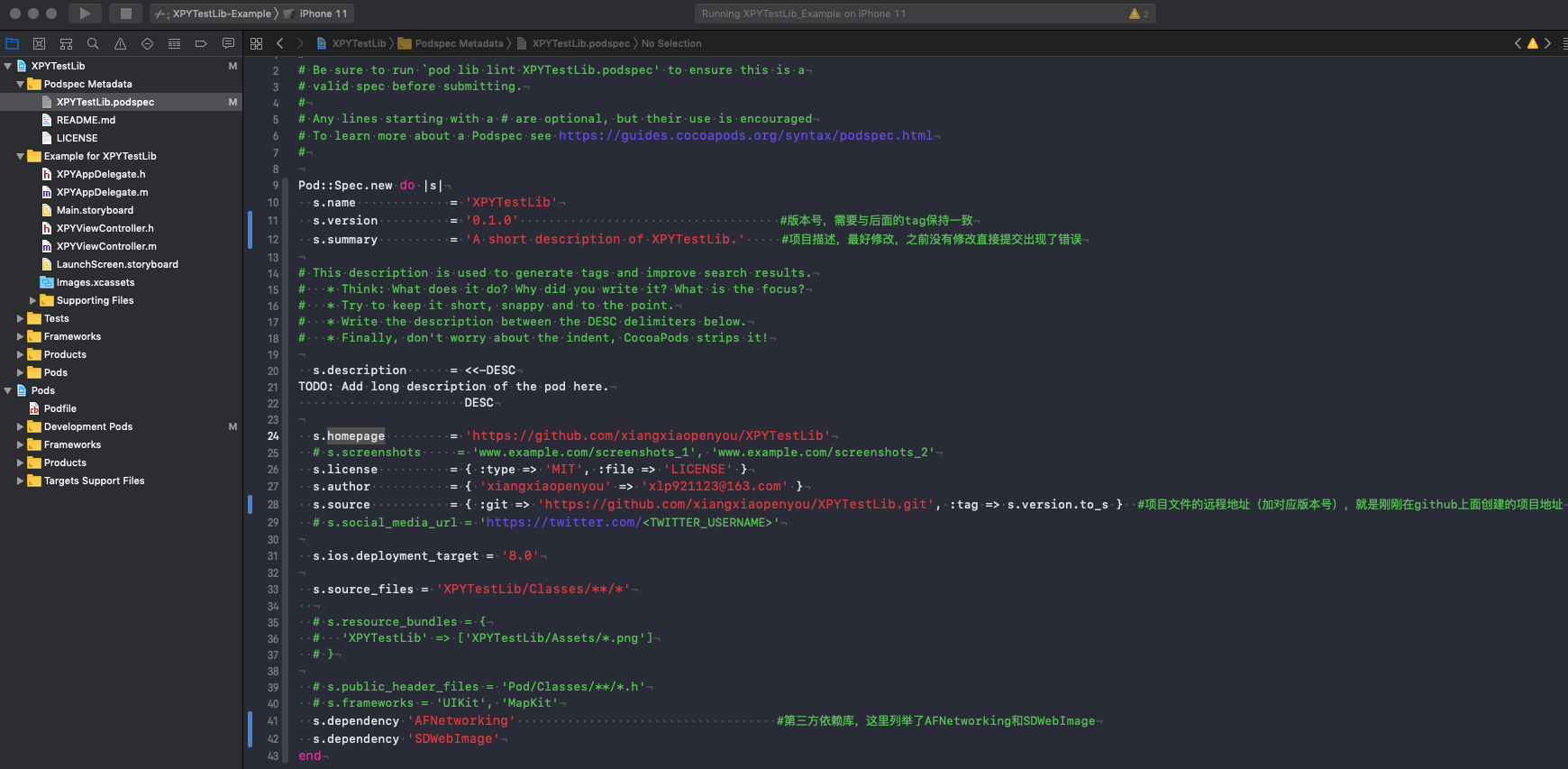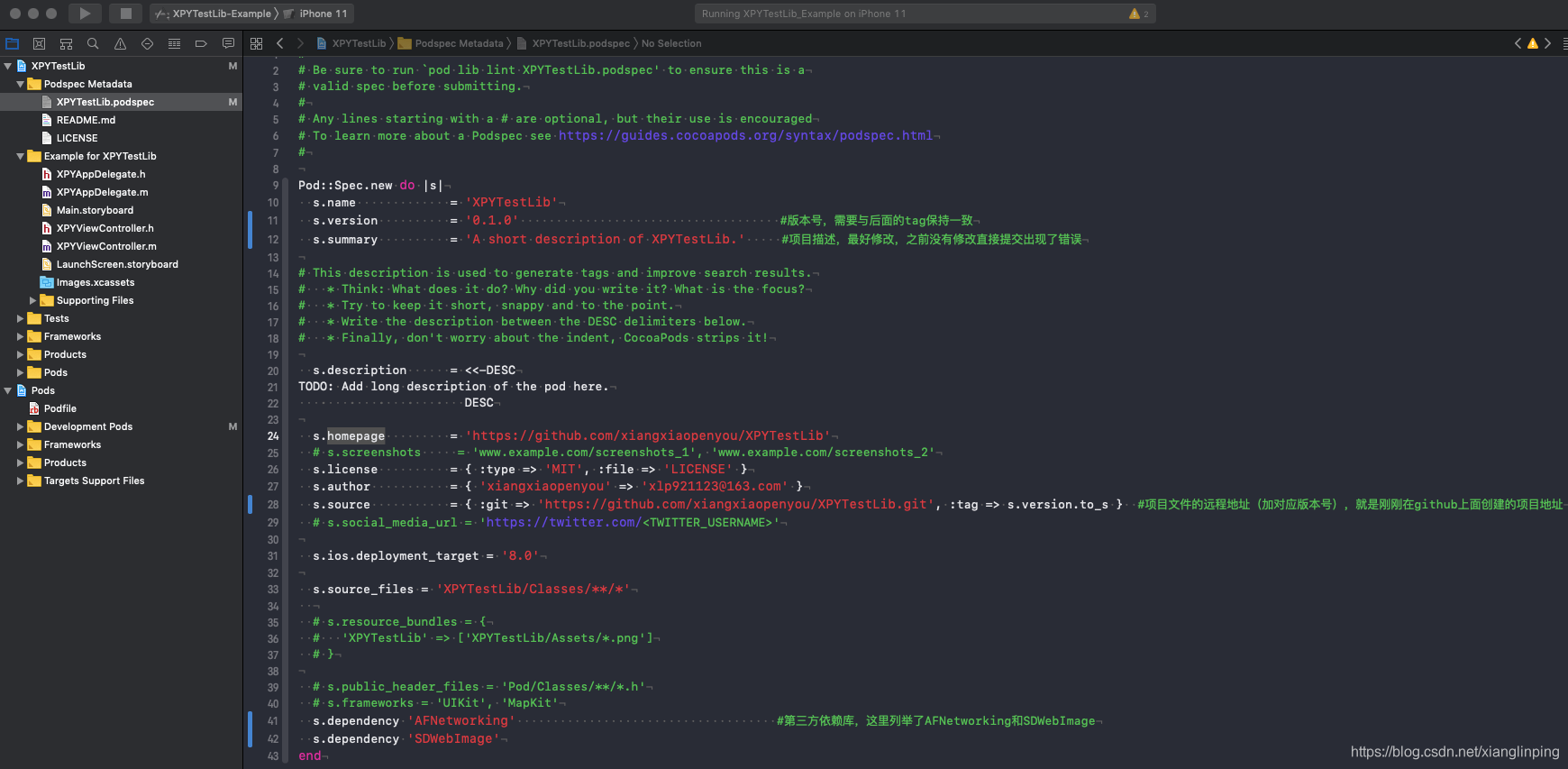 (2)至此就创建好了本地项目,可以在桌面看到XPYTestLib项目,进入项目的Example目录,打开XPYTestLib.xcworkspace,可以直接运行空白项目。可以看到Podspec Metadata目录下的XPYTestLib.podspec文件就是私有库管理文件,选中可以直接进行编辑。