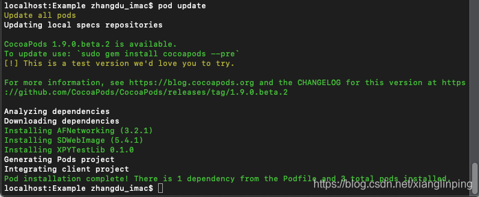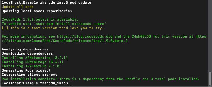 (3)编辑完终端进入Example目录,使用pod install命令,更新项目pod。这里因为pod版本问题可能会遇到各种问题,最常见的解决方法就是使用pod update命令先检查更新,关于cocoapods 1.8.0版本以后使用CDN还是继续使用以前版本的问题可以自行上网解决,推荐使用CDN,毕竟与时俱进。
