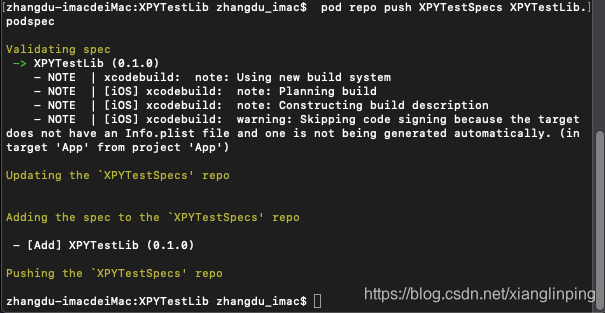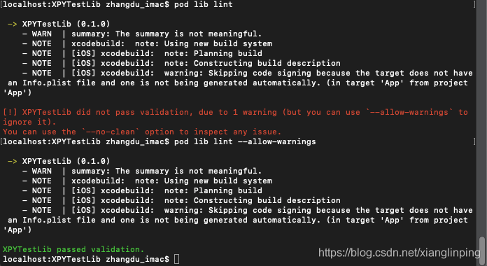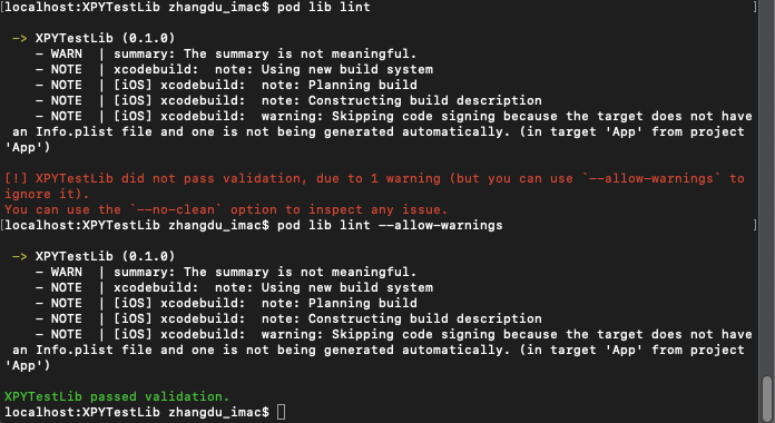 (4)验证该文件的有效性,终端进入XPYTestLib目录,使用pod lib lint命令验证,如果验证出现警告导致不通过(没有修改项目描述),可忽略警告使用pod lib lint --allow-warnings。注意:如果你依赖的第三方库包含静态库(.a文件),则需要使用