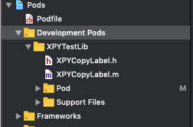 (5)进入XPYTestLib — XPYTestLib — Classes目录,可以看到有一个ReplaceMe.m文件,可以删除,然后把你需要使用Pod管理的文件放到这里,这里我随便放一个类文件(XPYCopyLabel.h和XPYCopyLabel.m)。使用终端进入Example目录,重新pod install,成功之后可以在Xcode中的Development Pods目录下看到多了刚刚加入的文件。