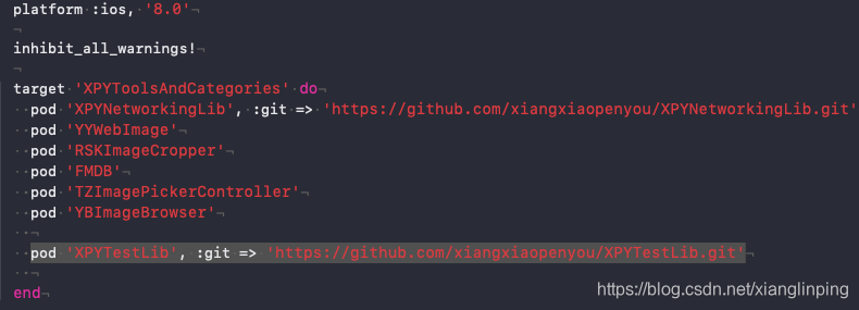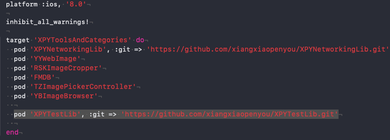 pod 'XPYTestLib', :git => 'https://github.com/xiangxiaopenyou/XPYTestLib.git'