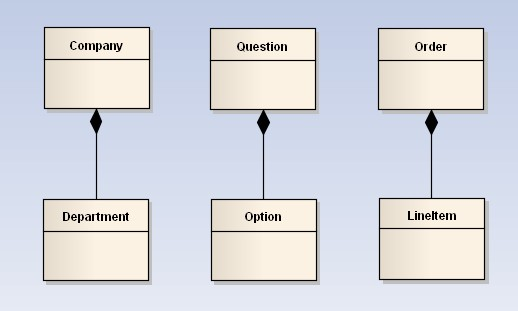 表示contains-a的关系,是一种强烈的包含关系。组合类负责被组合类的生命周期。是一种更强的聚合关系。部分不能脱离整体存在。如公司和部门的关系,没有了公司,部门也不能存在了;调查问卷中问题和选项的关系;订单和订单选项的关系。在类图使用实心的菱形表示,菱形从局部指向整体