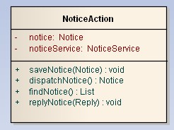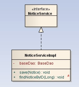 3. NoticeServiceImpl通过save方法的参数引用Notice,是依赖关系。同时调用了BaseDao完成功能,也是依赖关系。