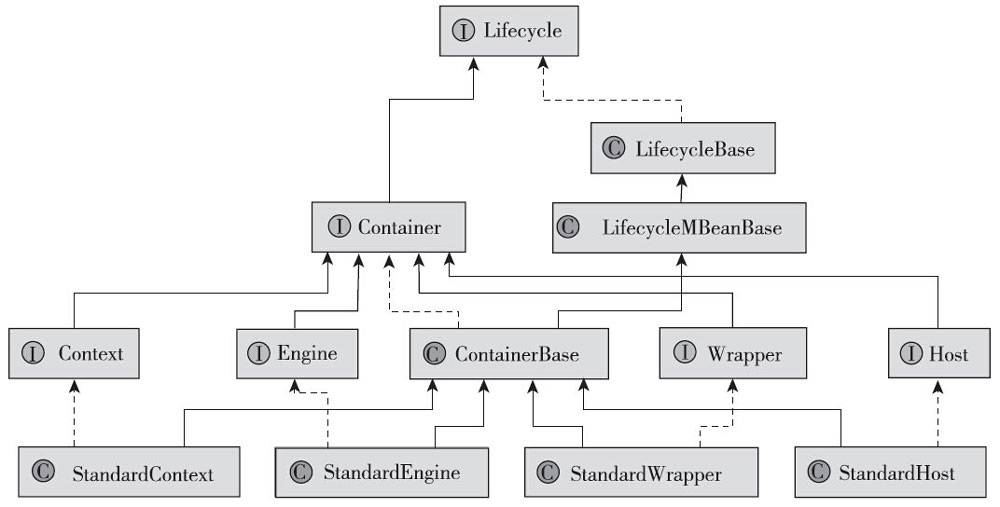 另外Container还继承了Lifecycle接口,而且ContainerBase间接继承了LifecycleMBeanBase类,所以Engine,Host,Context,WapperWapper,这四个子容器都符合Tomcat的生命周期管理模式。