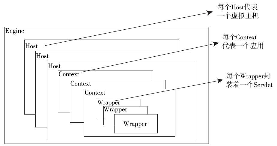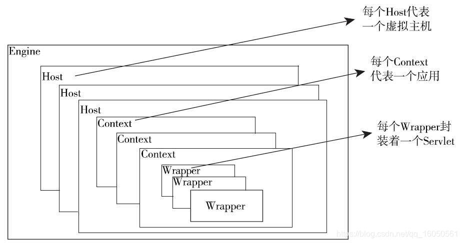 Engine,Host,Context,Wapper这四个子容器是逐层包含的关系,Engine是最顶层,每个service最多只能有一个Engine,Engine里面可以有多个Host,每个Host下可以有多个Context,每个Context里面可以包含多个Wapper。