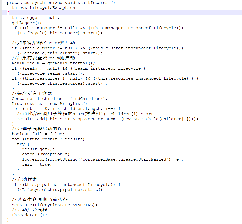 这里首先启动了Cluster和Realm,启动方法是直接调用它们的start方法。Cluster用于配置集群,在server.xml中有注释的参考配置,它的作用就是同步Session,Realm是Tomcat的安全域,可以用来管理资源的访问权限。子容器是使用startStopExecutor调用新线程来启动的,这样可以用多个线程来同时启动,效率更高,具体启动过程是通过一个for循环对每个子容器启动了一个线程,并将返回的Future保存到一个List中(更多线程相关内容会在异步处理中介绍),然后遍历每个Future并调用其get方法。遍历Future主要有两个作用:①其get方法是阻塞的,只有线程处理完之后才会向下走,这就保证了管道Pipeline启动之前容器已经启动完成了;②可以处理启动过程中遇到的异常。