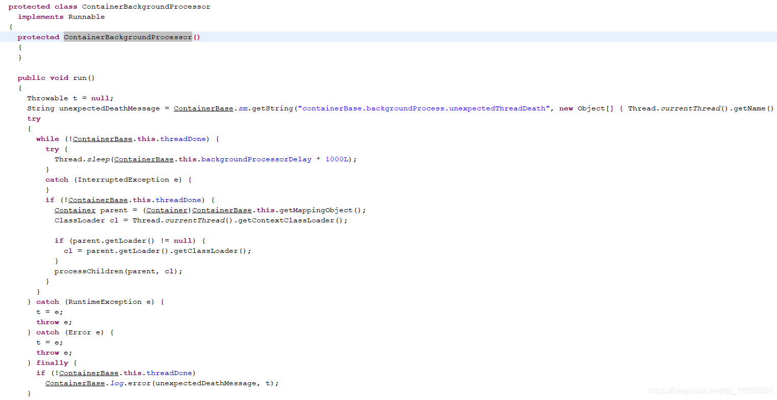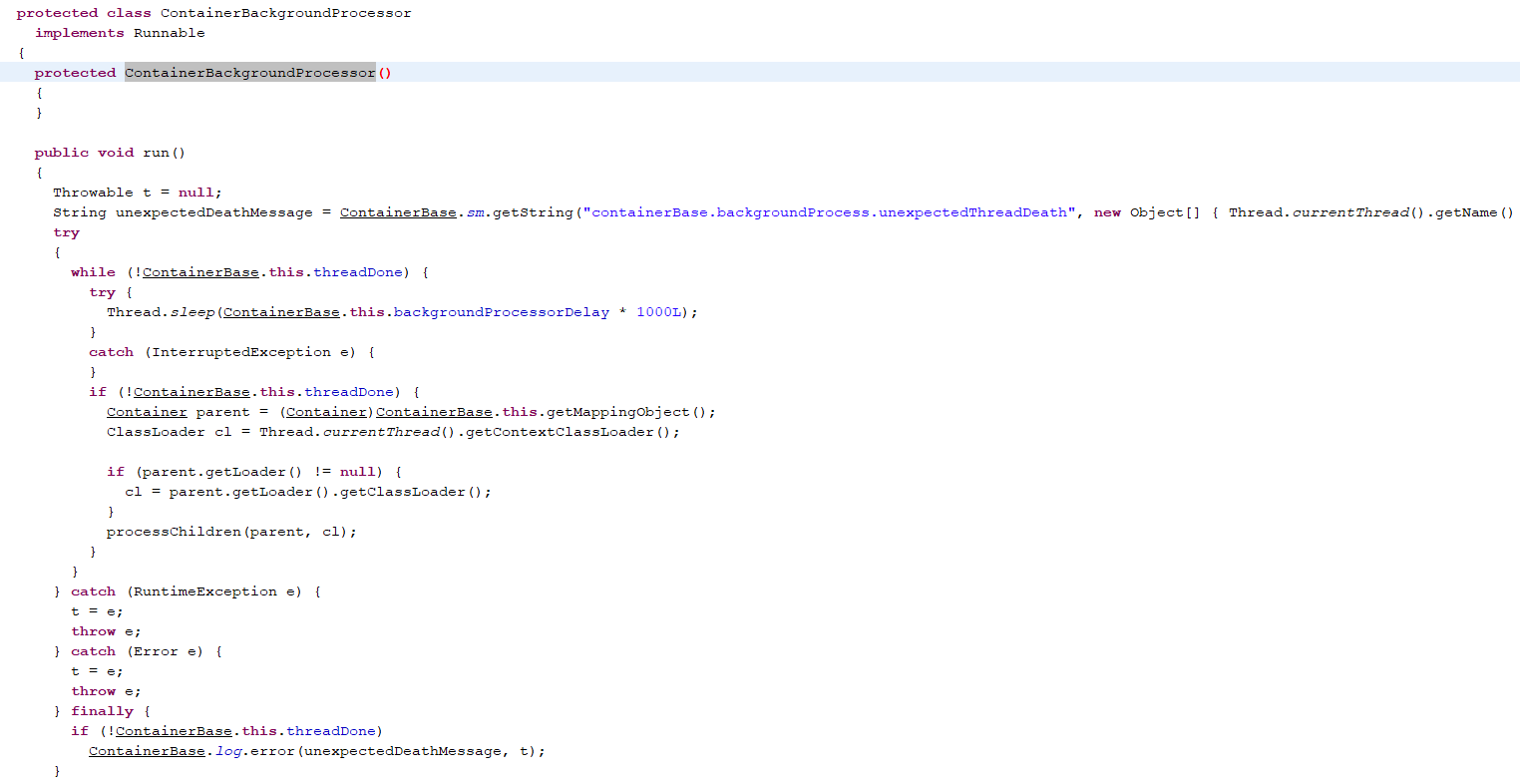 threadStart方法启动的后台线程是一个while循环,内部会定期调用backgroundProcess方法做一些事情,间隔时间的长短是通过ContainerBase的backgroundProcessorDelay属性来设置的,单位是秒,如果小于0就不启动后台线程了,不过其backgroundProcess方法会在父容器的后台线程中调用。backgroundProcess方法是Container接口中的一个方法,一共有3个实现,分别在ContainerBase、StandardContext和StandardWrapper中,ContainerBase中提供了所有容器共同的处理过程,StandardContext和StandardWrapper的backgroundProcess方法除了处理自己相关的业务,也调用ContainerBase中的处理。ContainerBase的backgroundProcess方法中调用了Cluster、Realm和管道的backgroundProcess方法;StandardContext的background-Process方法中对Session过期和资源变化进行了处理;StandardWrapper的backgroundProcess方法会对Jsp生成的Servlet定期进行检查。