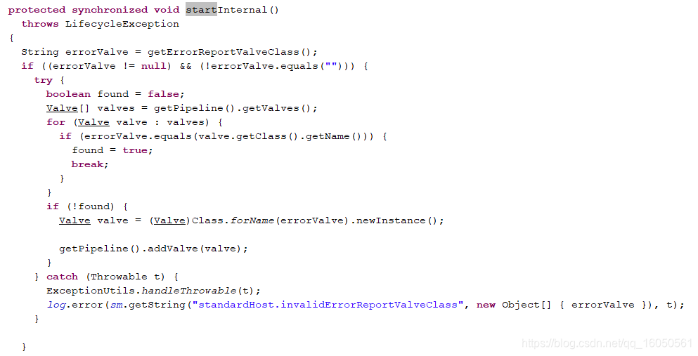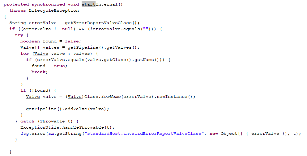 这里的代码看起来虽然比较多,但功能却非常简单,就是检查Host的管道中有没有指定的Value,如果没有则添加进去。检查的方法是遍历所有的Value然后通过名字判断的,检查的Value的类型通过getErrorReportValveClass方法获取,它返回errorReportValveClass属性,可以配置,默认值是org.apache.catalina.valves.ErrorReportValve,代码如下: