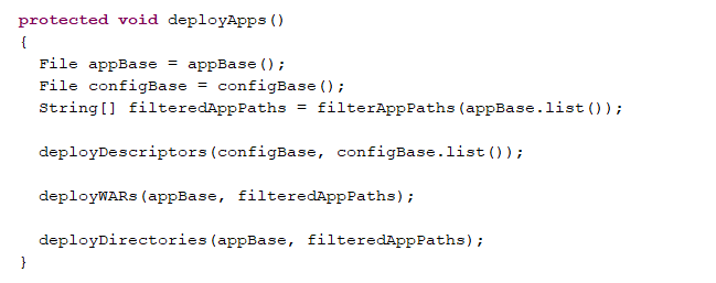 这就是StandardHost的startInternal方法处理的过程。Host的启动除了startInternal方法,还有HostConfig中相应的方法,HostConfig继承自LifecycleListener的监听器(Engine也有对应的EngineConfig监听器,不过里面只是简单地做了日志记录),在接收到Lifecycle.START_EVENT事件时会调用start方法来启动,HostConfig的start方法会检查配置的Host站点配置的位置是否存在以及是不是目录,最后调用deployApps方法部署应用,deployApps方法代码如下: