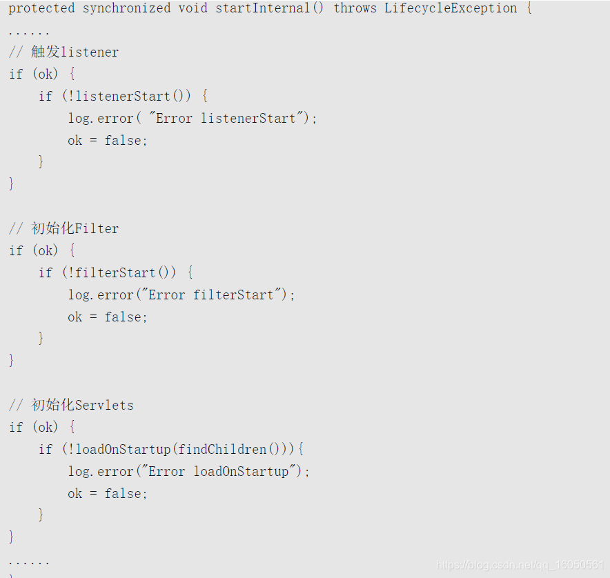 Context的默认实现类StandardContext在startInternal方法中调用了在web.xml中定义的Listener,另外还初始化了其中的Filter和load-on-startup的Servlet,代码如下: