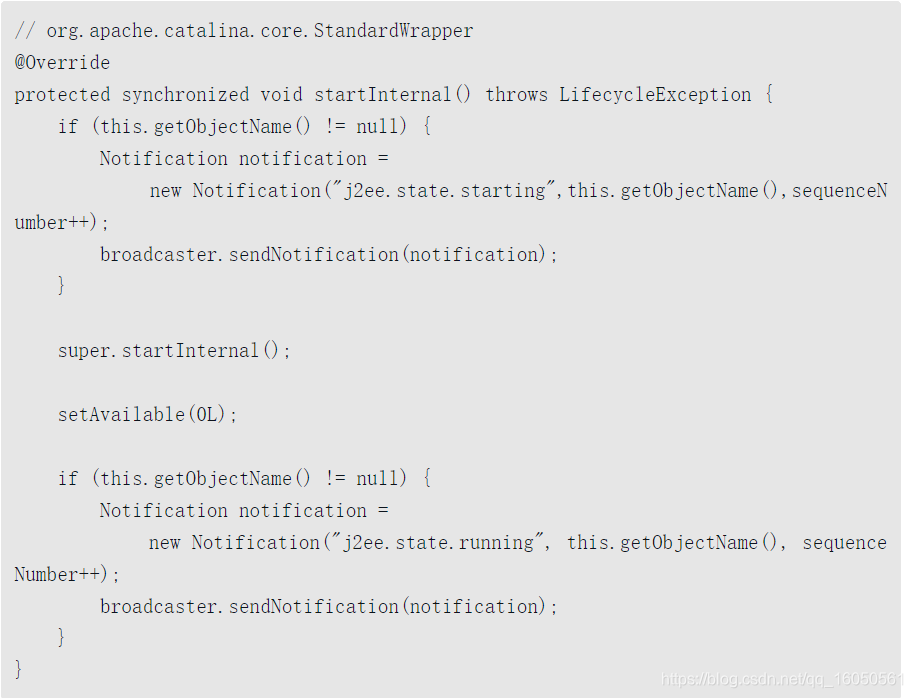 Wrapper的默认实现类StandardWrapper没有重写initInternal方法,初始化时会默认调用ContainerBase的initInternal方法,startInternal方法代码如下: