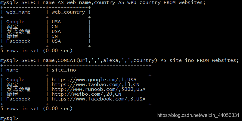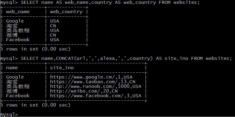 在上面的 SQL 语句中,我们把三个列(url、alexa 和 country)结合在一起,并创建一个名为 "site_info" 的别名。