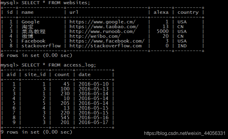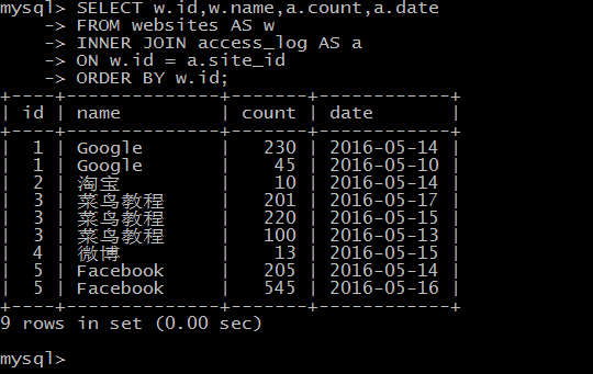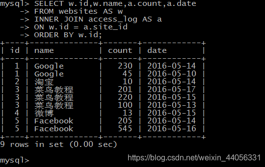 INNER JOIN 关键字在表中存在至少一个匹配时返回行。如果 "Websites" 表中的行在 "access_log" 中没有匹配,则不会列出这些行。