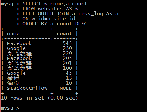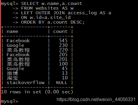 LEFT JOIN 关键字从左表(Websites)返回所有的行,即使右表(access_log)中没有匹配。