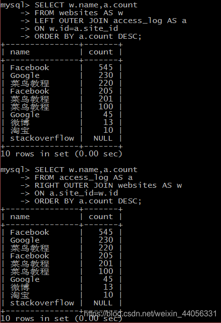 FULL OUTER JOIN 关键字结合了 LEFT JOIN 和 RIGHT JOIN 的结果。