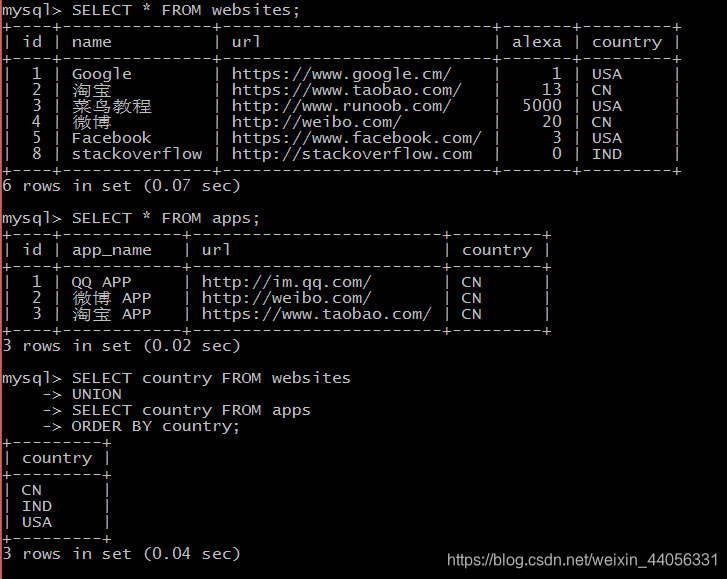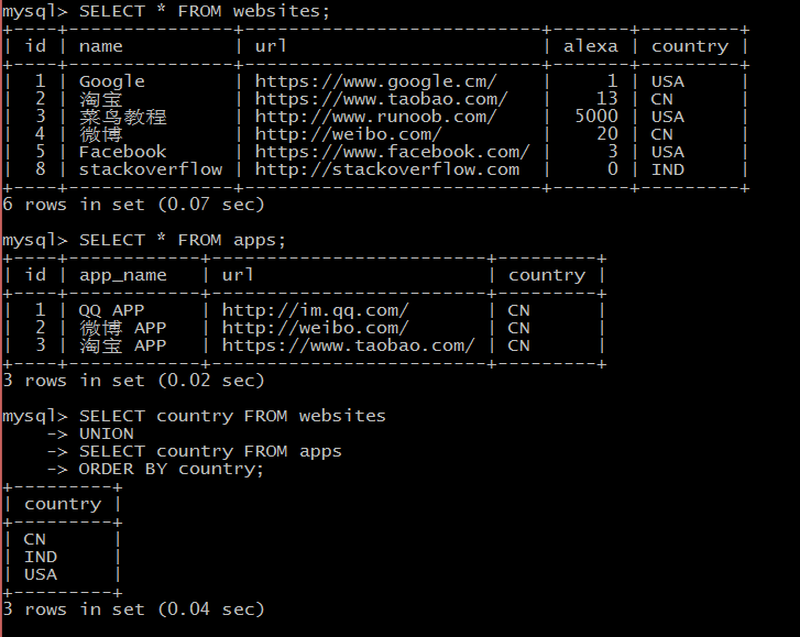 注释:默认地,UNION 操作符选取不同的值。如果允许重复的值,请使用 UNION ALL。UNION 结果集中的列名总是等于 UNION 中第一个 SELECT 语句中的列名。
