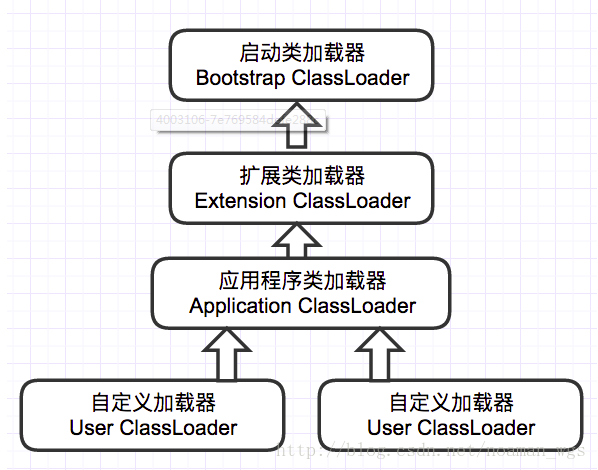 双亲委派模型中类加载器之间是有层次关系的如下图: