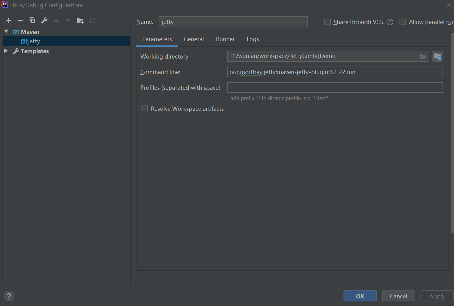4.在Name中设置运行实例名称,Parametes选项中Working directory为当前项目的路径,Command line中输入org.mortbay.jetty:maven-jetty-plugin:6.1.22:run,如果是多模块项目,需要把Resolve Workspace artifacts也勾上。