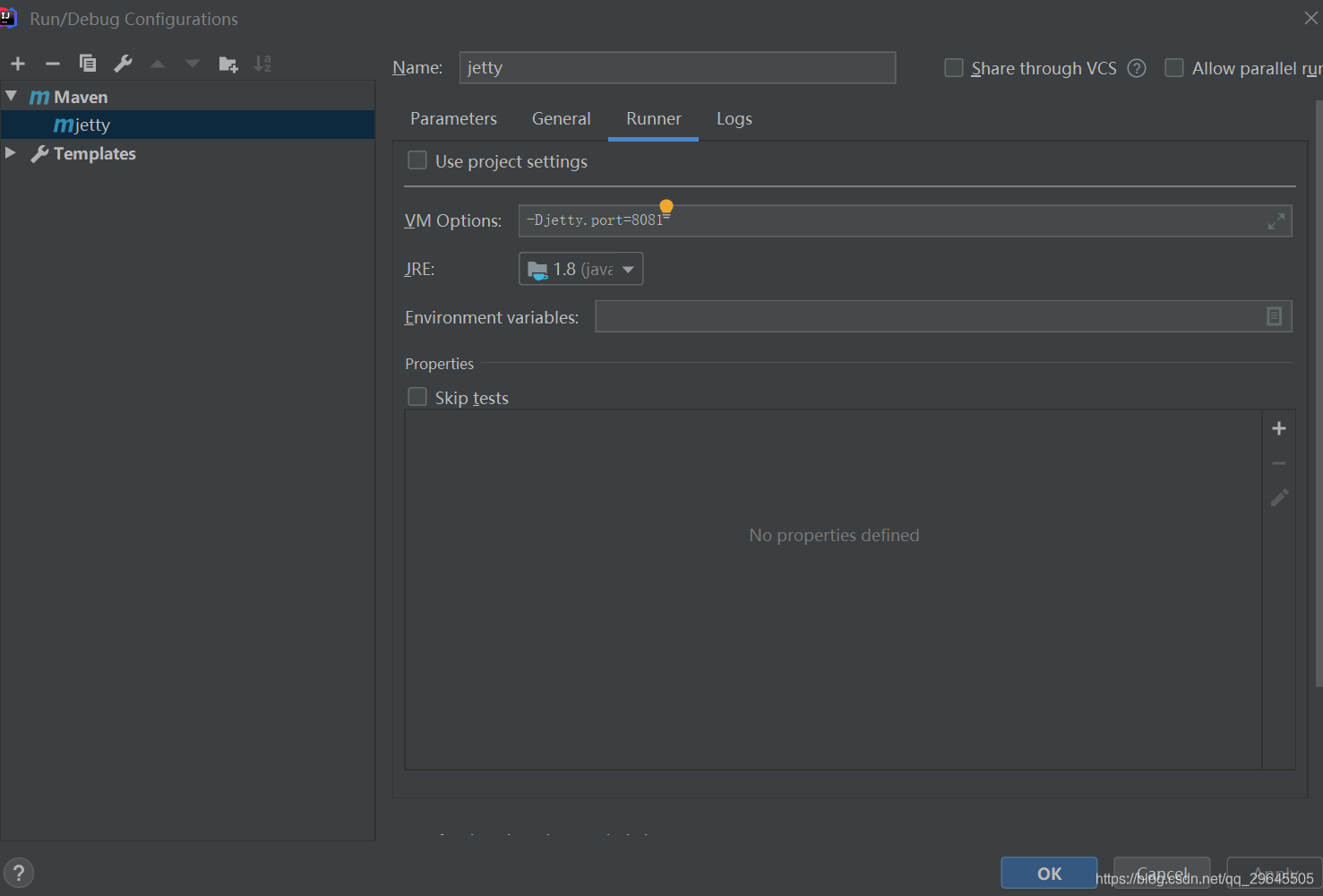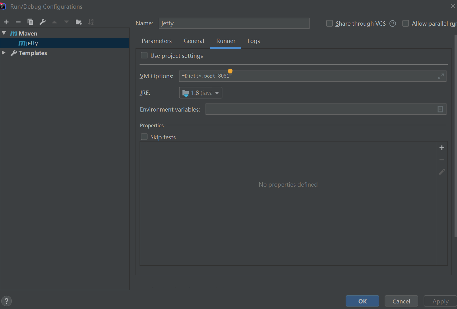 5.点击跳到Runner选项中,去掉Use project settings的勾,VM Options中配置端口号为Djetty.port=8080,端口根据实际需要进行设置即可。