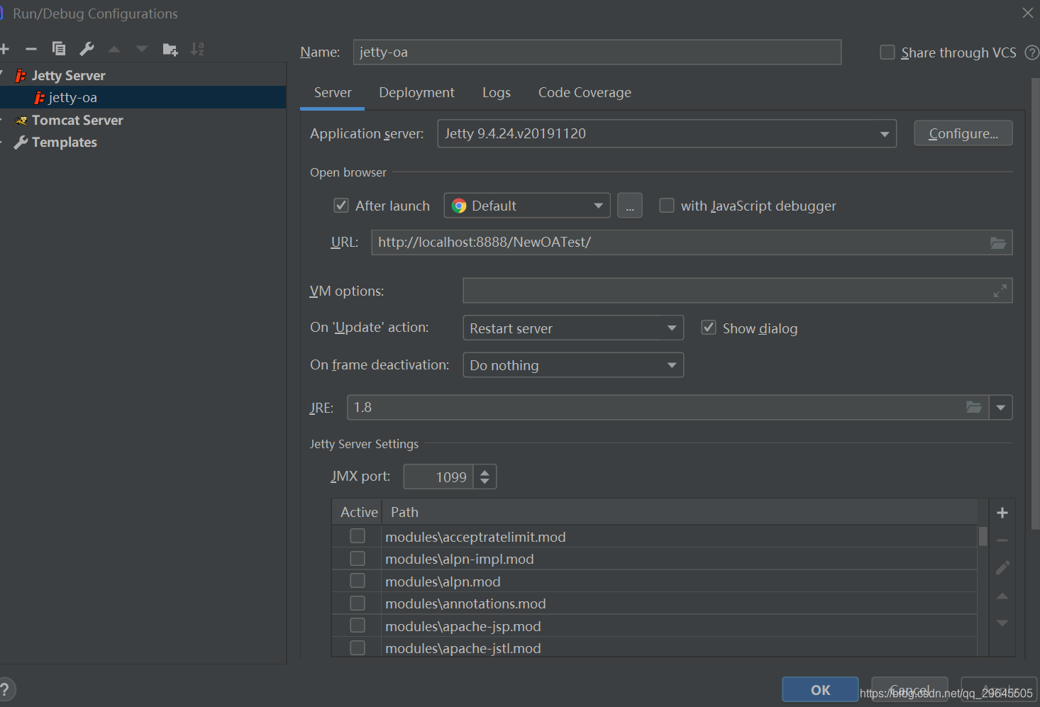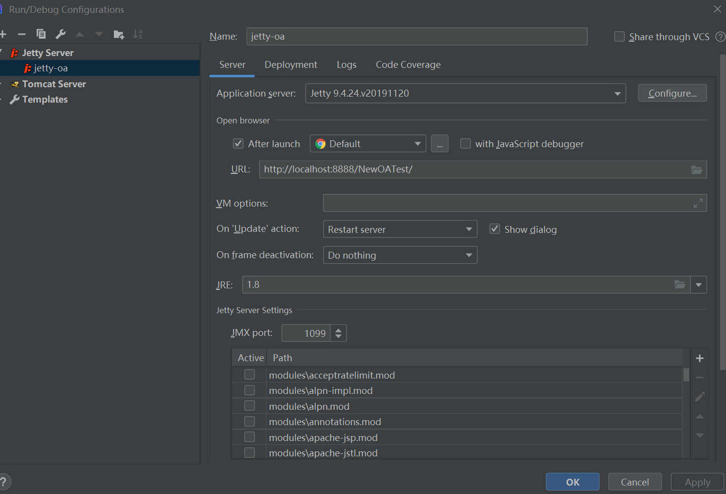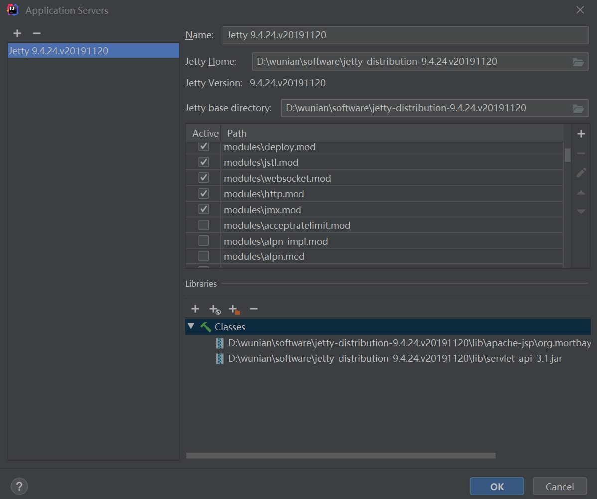 2.设置好Name,点击Application Server右侧的Configure...按钮,在弹出窗口中,在Jetty Home中选择Jetty根目录路径,会自动带出其余的参数。在下方的path列表中,需要额外勾选出modules\jmx.mod项,否则会报错。
