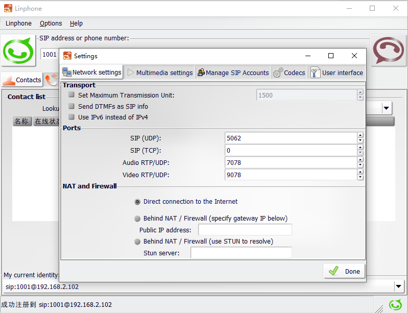 (1)udp端口,默认5060,若本地开了sip服务器(如brekeke、asterisk)会占用此端口,可以修改linphone(sip客户端)为其它端口