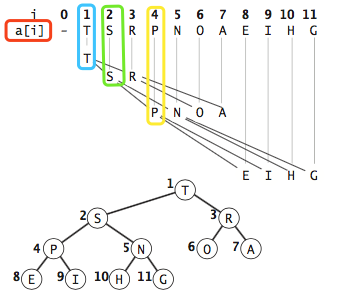 二叉堆一般用数组来表示。如果根节点在数组中的位置是1,第n个位置的子节点分别在2n和 2n+1。因此,第1个位置的子节点在2和3,第2个位置的子节点在4和5。以此类推。这种基于1的数组存储方式便于寻找父节点和子节点。