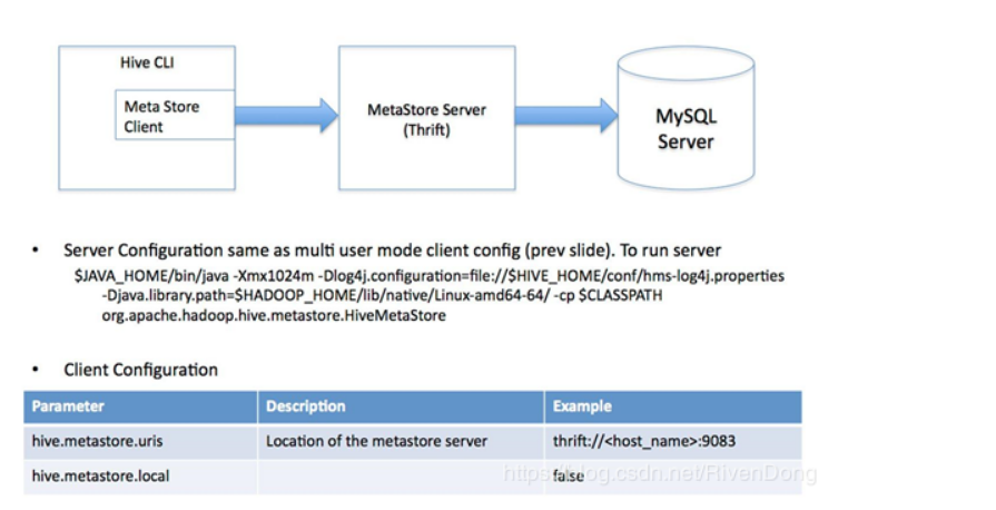 用于非Java客户端访问元数据库,在服务器端启动MetaStoreServer,客户端利用Thrift协议通过MetaStoreServer访问元数据库。