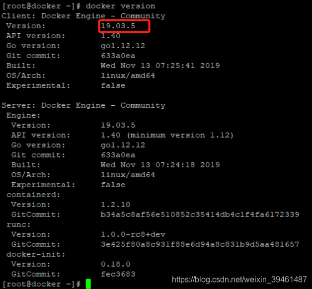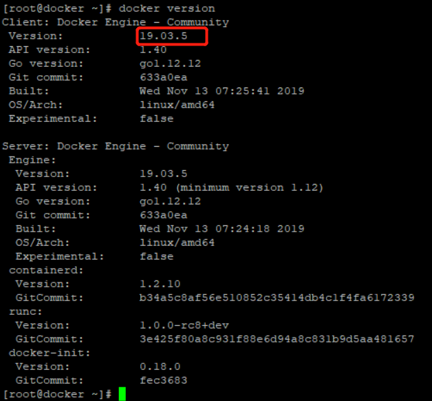 4)安装Docker,命令:yum install docker-ce-版本号,我选的是docker-ce-19.03.5,